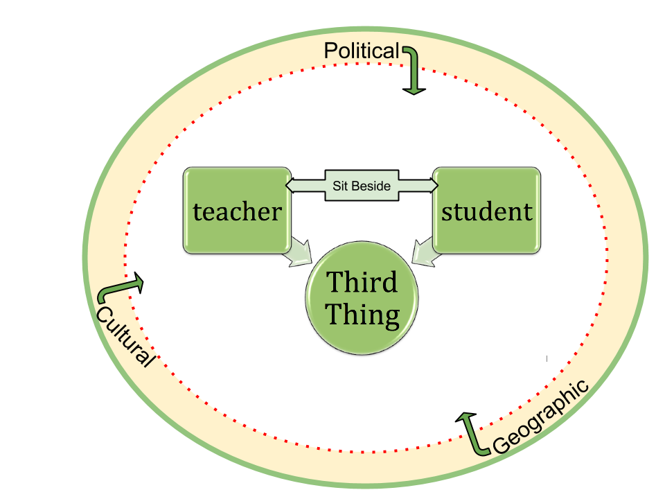 Agency is achieved when the focus of the teacher/student relationship begins with the ‘third thing’ (Palmer) and ends with understanding each other. This ‘third thing’ can be the content, concept, problem, big idea, issue or learning object around which the learning occurs. When you and I, teacher and student, sit beside each other, examine and explore this ‘third thing’, talk about it, problem through it together, we learn first, but also come to know each other and ourselves. Ways of knowing and ways of being are intertwined in our collaborative agency with new knowledge and strengthened relationship. As I do in my own teaching practice, I move to sit beside my student (or frequently squat down) to talk, listen and learn about what they are doing, thinking, or wondering. Using metaphor or story is something I’ll use to clarify thinking or to gain understanding.