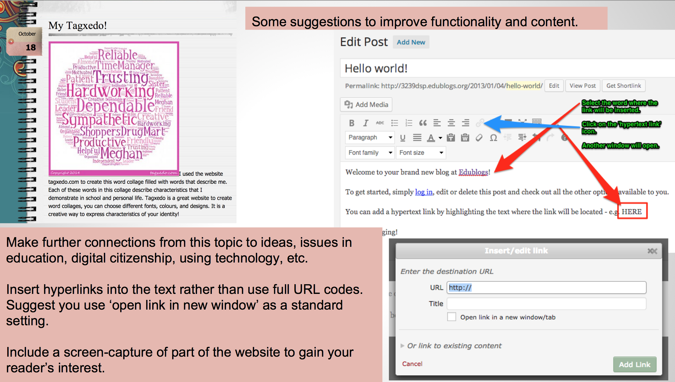 - This year I provided feedback to students as a google presentation using skitch to annotate images captured from their blog sites. While this was an effective way to show students what I noticed or where to make improvements, it did not ensure that students understood my directions or suggestions.