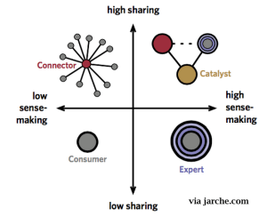 This past week an image and tweet was a catalyst for my own thinking. Harold Jarache’s blog post Knowledge Catalysts was the source of the image and tweet. I immediately thought of those people who are my knowledge catalysts – those who prompt me to think, filter, curate, and do within digital spaces. These people are high on the sense-making scale, high on the sharing scale and engage in diverse knowledge networks. They go beyond consuming or connecting by modelling an expertise in domains such as higher ed, leadership, digital proficiency etc.