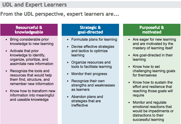 Then my reflection went to this summary from the UDL (Universal Design for Learning:CAST) perspective. Expert learners are resourceful & knowledgeable, strategic & goal directed, as well as purposeful & motivated. These points can focus on my work as a teacher/learner and the work that I do with students.